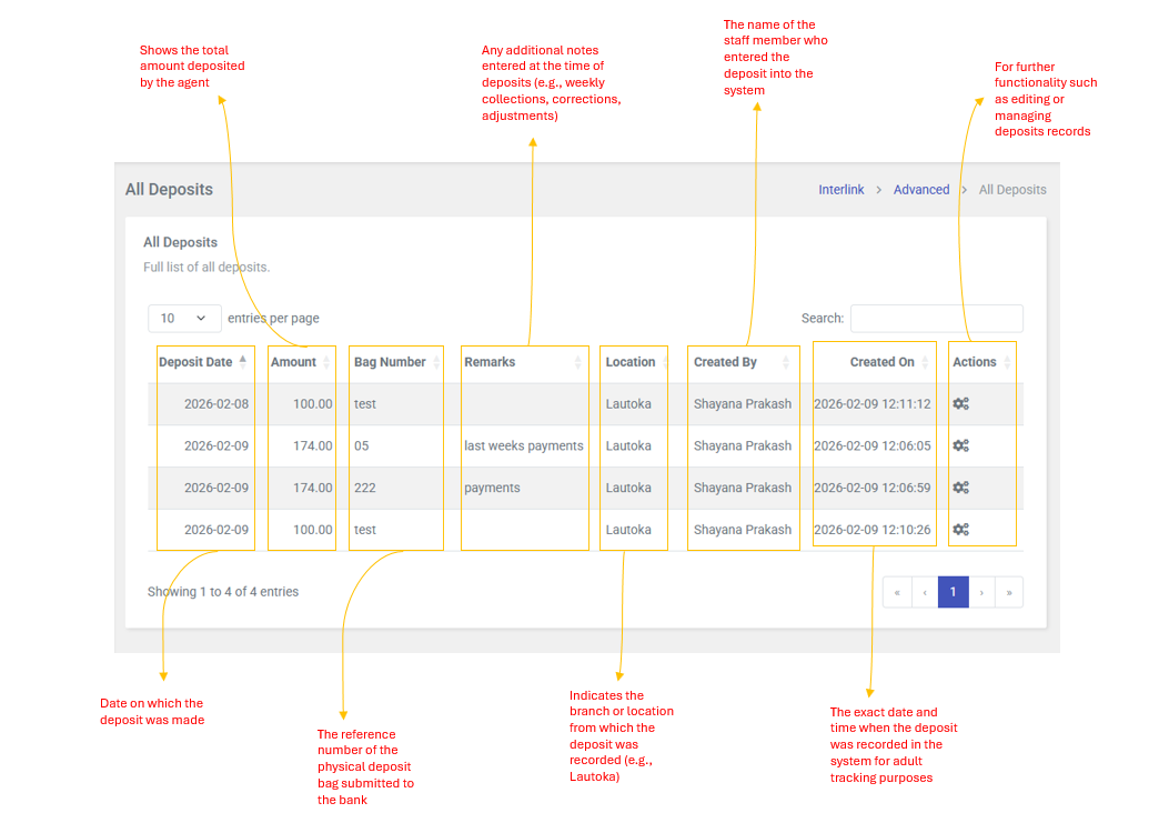 This page provides a complete list of all deposits recorded by agents across locations. it allows administrators and accounts staff to monitor, review, an track deposit entries efficiently for reconciliation and financial control purposes.