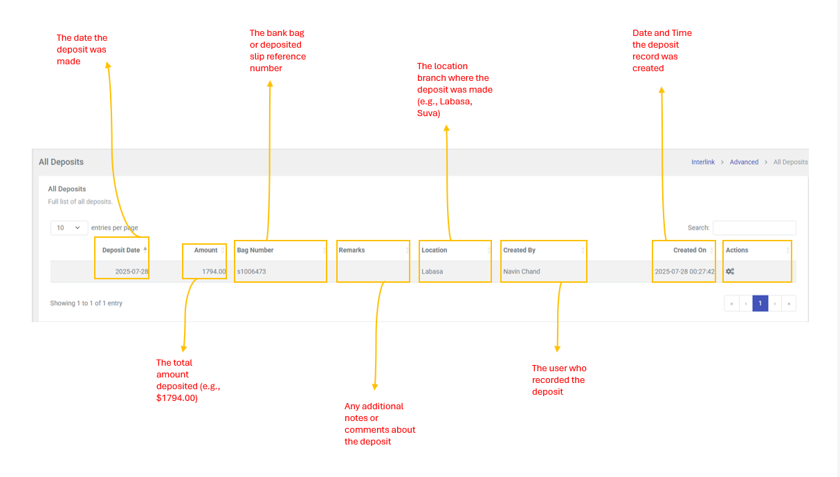 | Created By | The user who recorded the deposit |