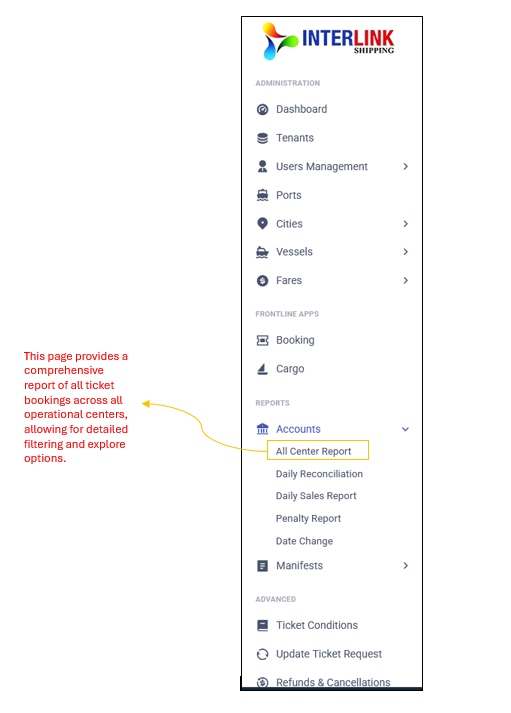You can access the All Center Report page by expanding the 'Accounts' dropdown under the 'Reports' section in the left sidebar and clicking on 'All Center Report'. This page provides a comprehensive report of all ticket bookings across all operational centers, allowing for detailed filtering and export options.