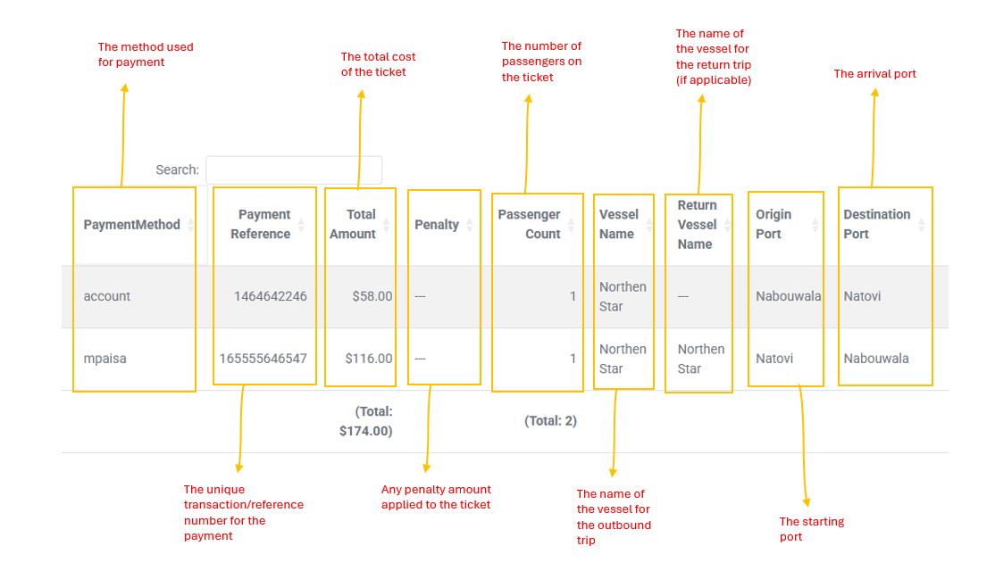 The table also includes pagination controls (e.g., "10 entries per page") and a search bar to filter records. A footer row displays totals for 'Total Amount' and 'Passenger Count'.