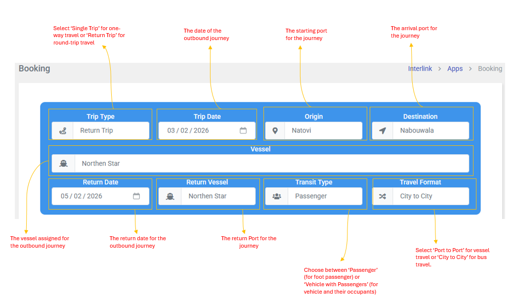 - If 'Return Trip' is selected, additional fields for 'Return Date' and 'Return Vessel' will appear.