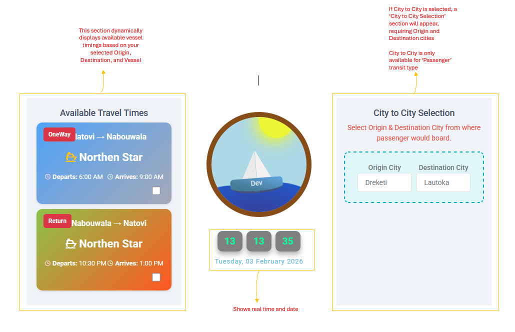 This section dynamically displays available vessel timings based on your selected Origin, Destination, and Vessel. For 'Return Trip', ensure both single and return times are selected for accurate ticket details.