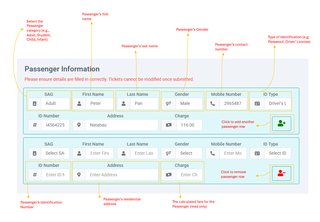 This section is for adding details of all passengers. You can add multiple passengers to a single ticket. Please ensure all details are filled in correctly as tickets cannot be modified once submitted.