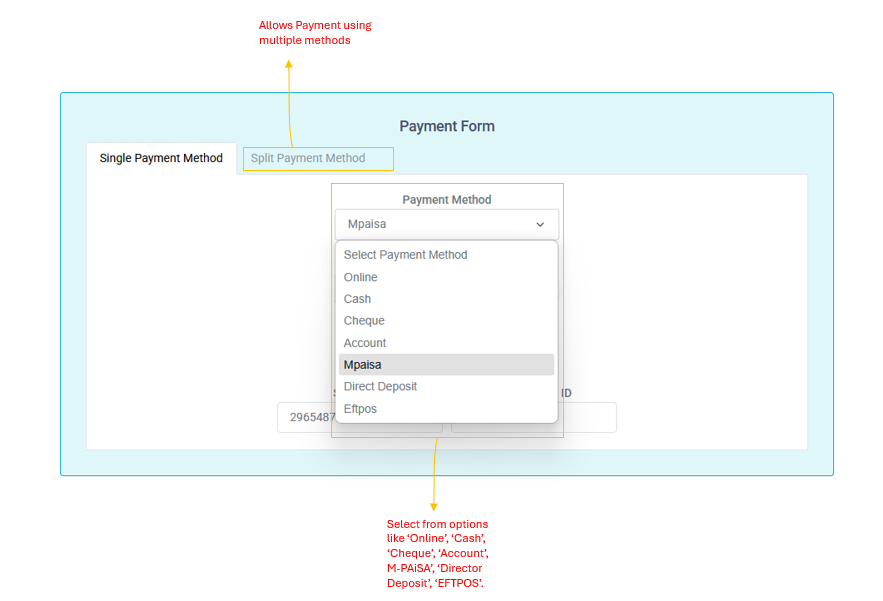 - Payment Method: Select from options like 'Online', 'Cash', 'Cheque', 'Account', 'Mpaisa', 'Direct Deposit', 'Eftpos'.