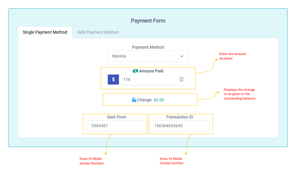 - Split Payment Method: (Currently disabled) Allows payment using multiple methods.