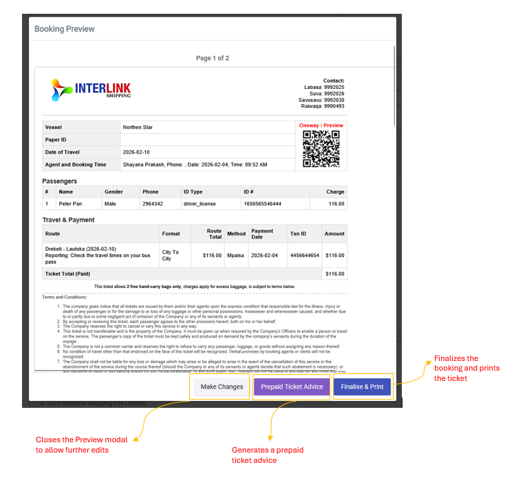 - Finalise & Print: Finalizes the booking and prints the ticket.