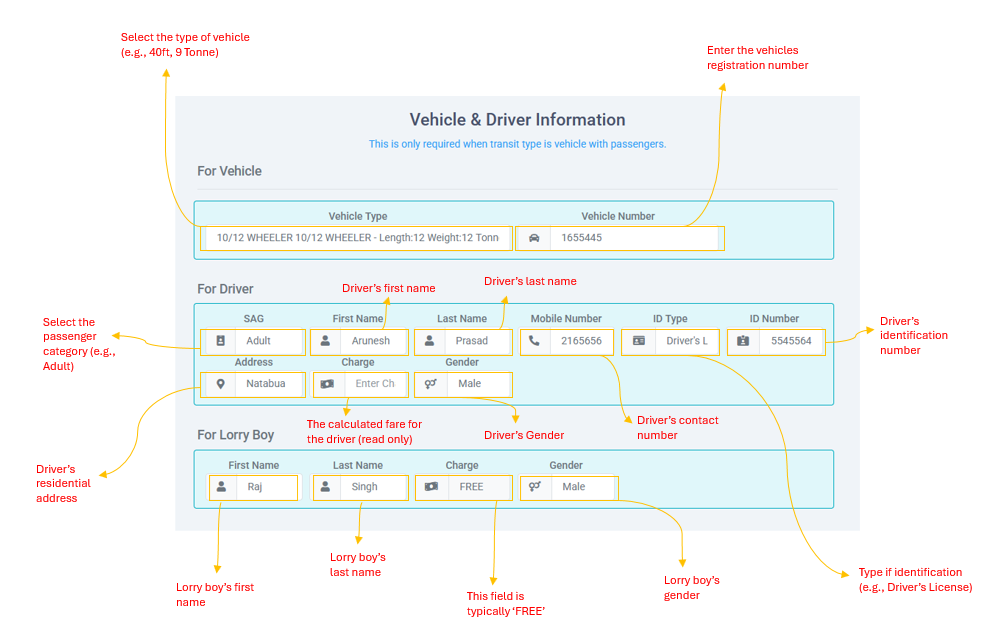 This section appears only when 'Transit Type' is set to 'Vehicle with Passengers'. It requires details for both the vehicle and the driver.