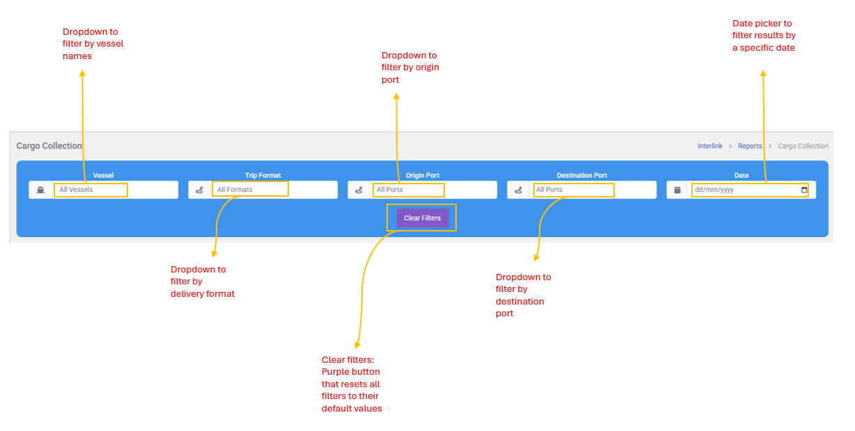 The Cargo Collection page has a blue-colored filter section at the top with the following controls: