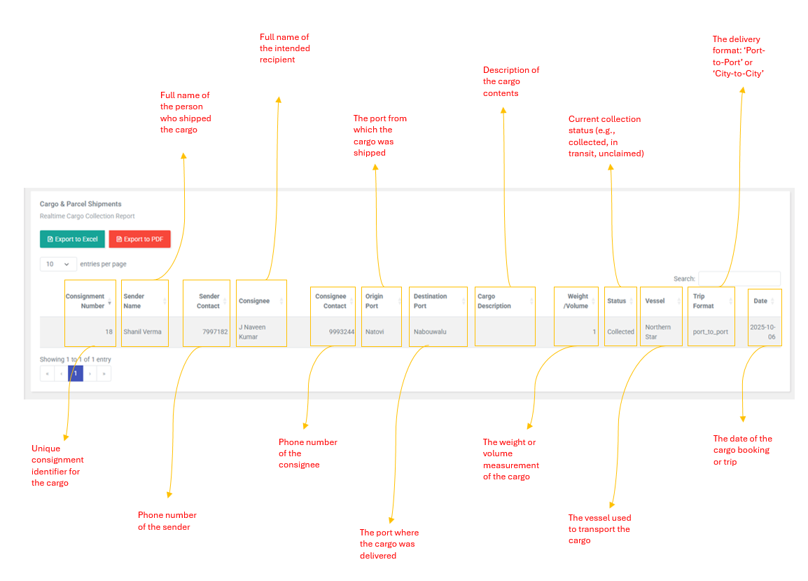 | Note: This is a read-only report. There are no create, edit or delete actions. the system automatically tracks cargo collection status . Use the filter bar and table search to find specific shipments. |
