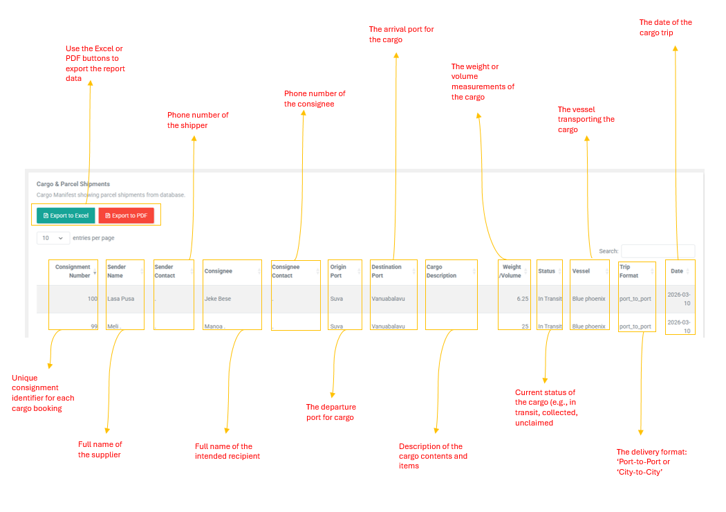 The Cargo Manifest report generates a complete list of all cargo items loaded onto a specific vessel for a given date. It servers as the official shipping document showing all parcels and shipments on a particular trip. it features a prominent blue filter bar at the top o generate the manifest.