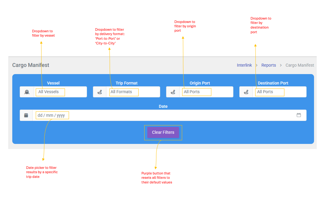 The Cargo Manifest page has a blue-colored filter section at the top with the following controls (identical to the Cargo Collection Filters):