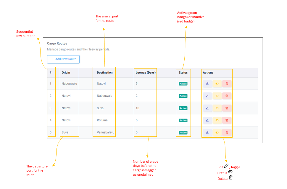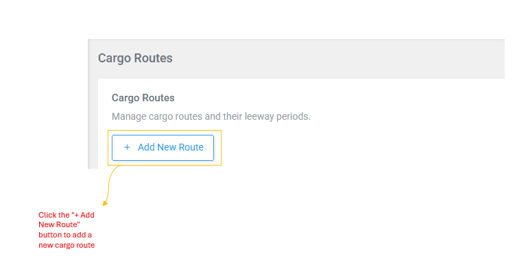Cargo Routes define the shipping routes between ports and their associated leeway periods. The leeway is the number of days after a shipment is booked before it is considered unclaimed. This is a unique feature of the Cargo Portal that does not exist in the Passenger Portal.