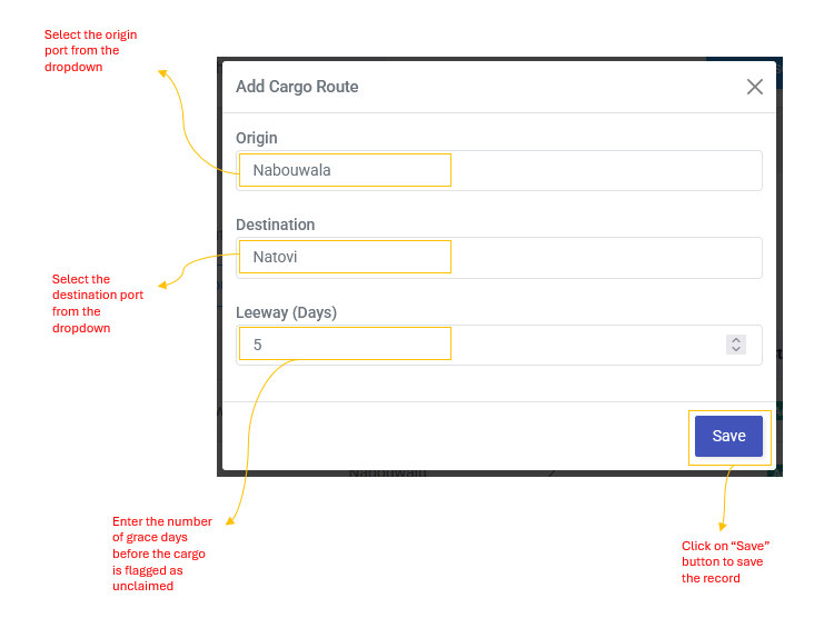 | Leeway (Days) | Number of grace days before the cargo is flagged as unclaimed (e.g., 2,5, or 10 days) |