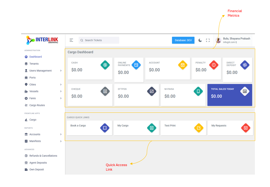The Dashboard id the landing page their after login. It provides a real-time overview of daily financial activity and quick shortcuts to commonly used features.