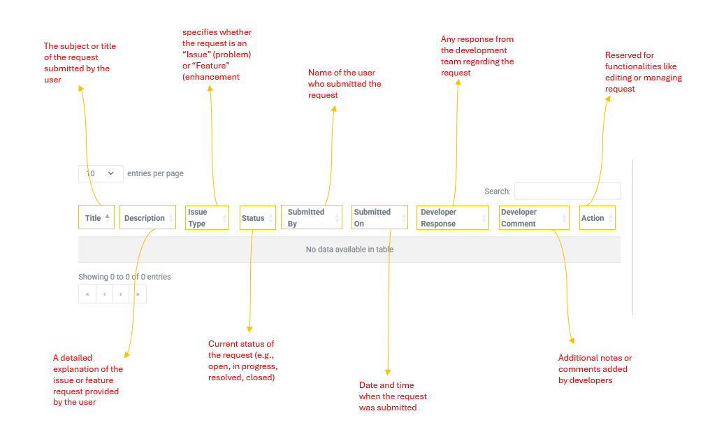 The page allows users to submit, track, and manage issues or feature requests. Administrators, developers, and support staff can monitor submitted requests efficiently, respond to users, and ensure timely resolution of system problems or improvements.