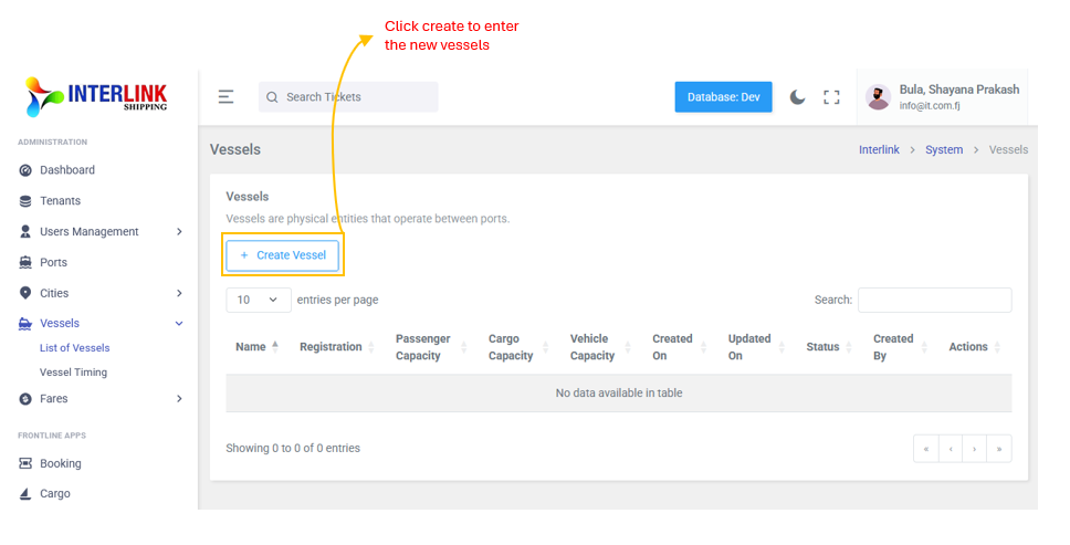 To add a new vessel, click the "Create Vessel" button. This will open a modal where you can enter the new vessel's details, including: