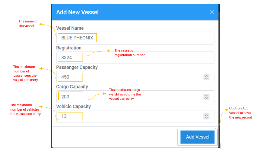 Click "Add Vessel" within the modal to save the new record.