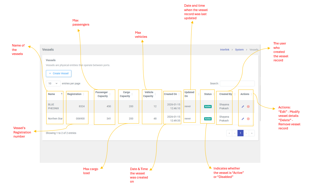 Badge: bg-success(green) for Active. - Created By: The user who created the vessel record.