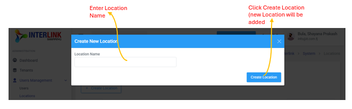 To add a new location, click the "Create Location" button. This will open a modal where you can enter the new location's details, including: