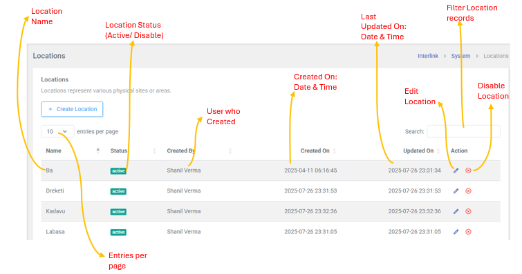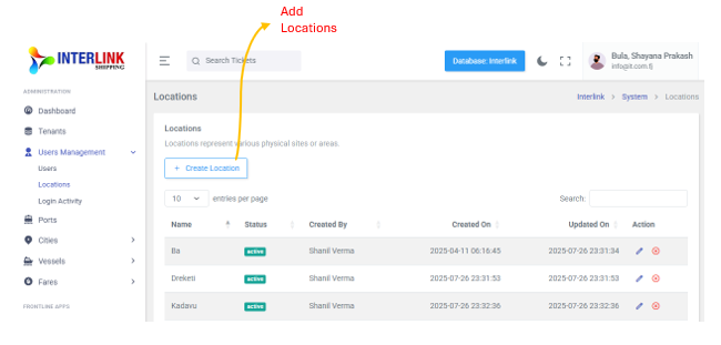 The Locations page allows administrators to manage various physical sites or areas within the Interlink Shipping platform. This page is accessible by expanding the 'Users Management' dropdown in the left sidebar and clicking on 'Locations'. Here, you can view, create, edit, and disable location records.