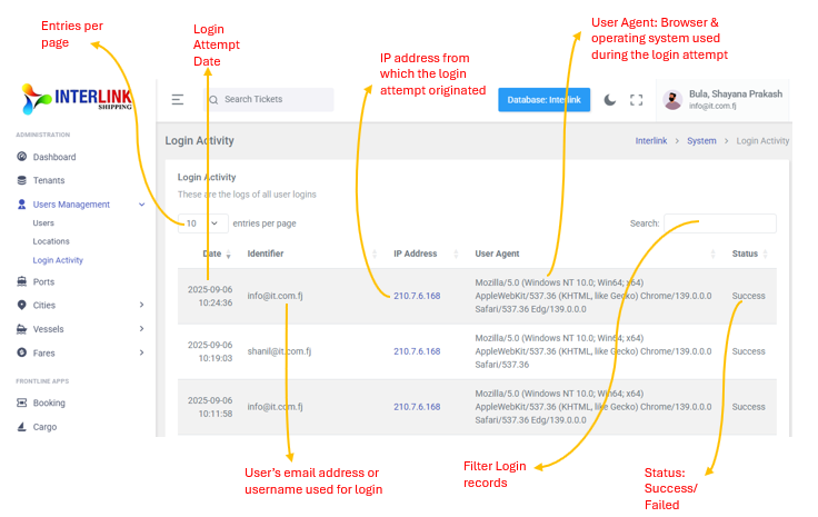 The Login Activity page provides a comprehensive log of all user login attempts and sessions within the Interlink Shipping platform. This page is accessible by expanding the 'Users Management' dropdown in the left sidebar and clicking on 'Login Activity'. It is a crucial tool for monitoring security and troubleshooting login issues.
