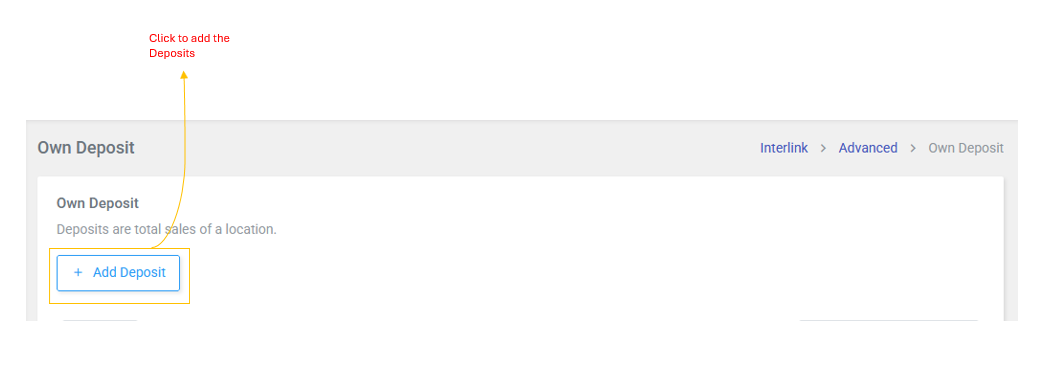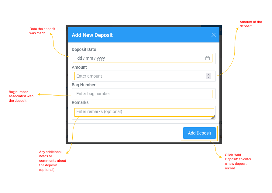 To record a new deposit, click the "Add Deposit" button. This will open a modal where you can enter the deposit's details, including: