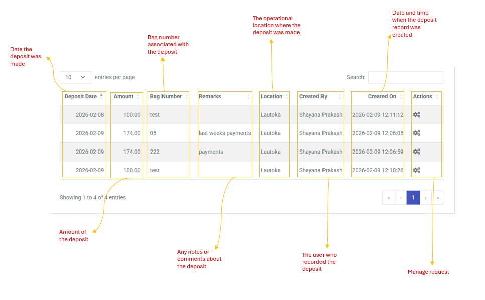 The main section of the page displays a table listing all recorded deposits with the following columns: