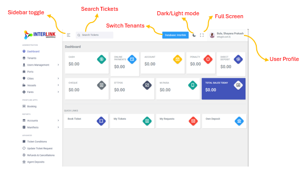 - User Profile: Displays your name (e.g., "Bula, Shayana Prakash") and email (e.g., "info@it.com.fj"). Clicking on it reveals a dropdown menu with a "Logout" option.