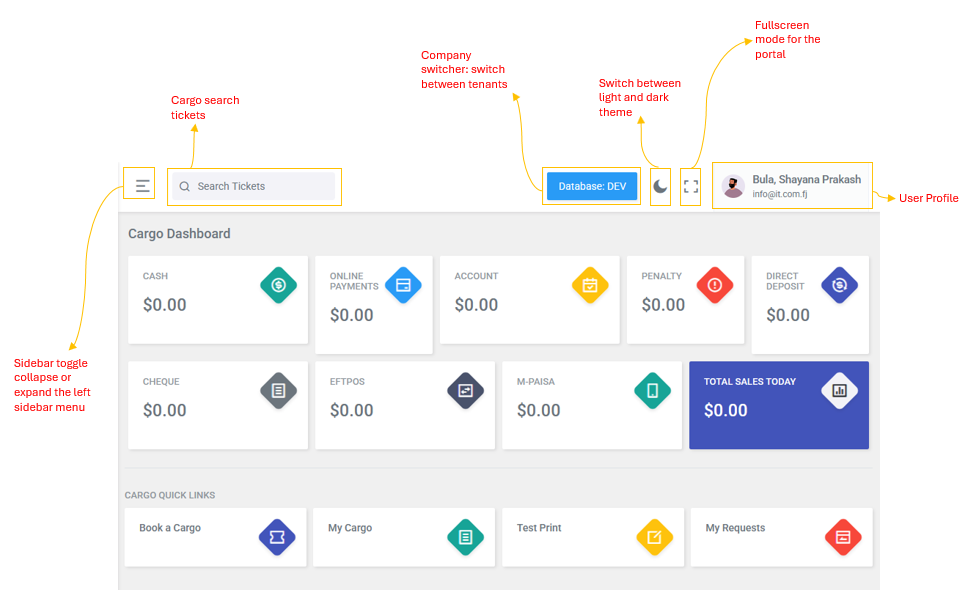 | Avatar + Name | User Profile | Displays the logged-in user name and email. Click to access the Logout option. |