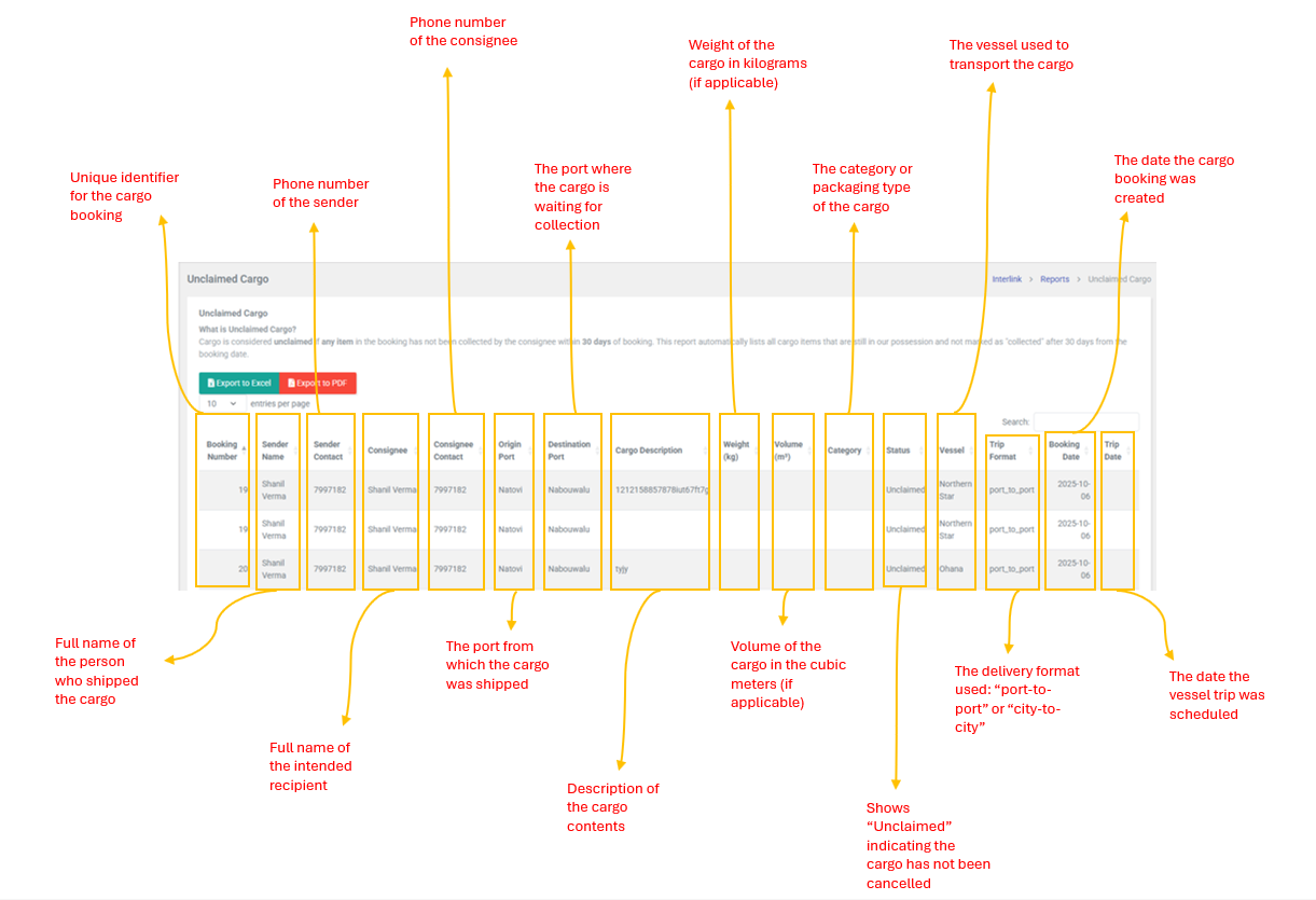 Cargo is considered unclaimed if any item in the booking has not been collected by the consignee within 30 days of booking. This reports automatically lists all cargo items that are still in possession and not marked as "collected" after 30 days from the booking date. it helps operations teams identify shipments that require follow-up or disposal action.