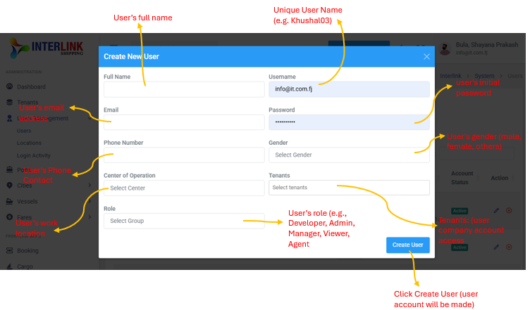 To add a new user account, click the "Create User" button. This will open a modal where you can enter the new user's details, including: