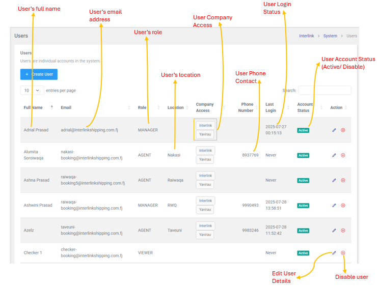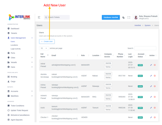 The Users page allows administrators to manage individual user accounts within the Interlink Shipping platform. This page is accessible by expanding the 'Users Management' dropdown in the left sidebar and clicking on 'Users'. Here, you can view, create, update, and disable user records.