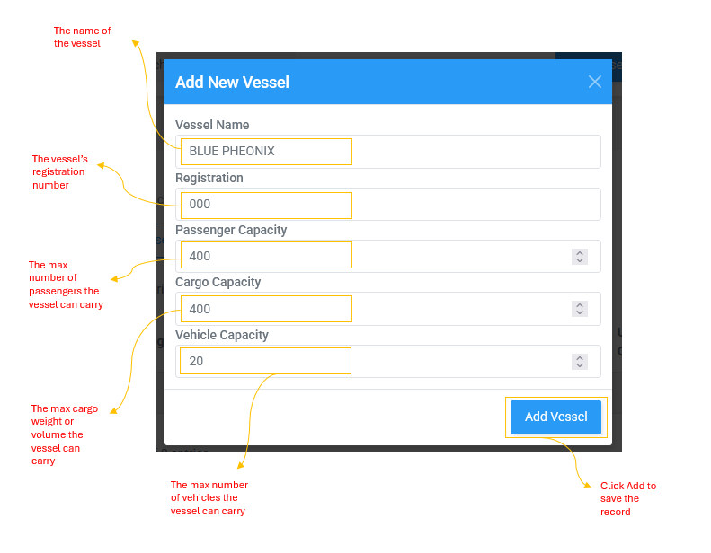 - Enter: Vessel Name, Registration Number, Passenger Capacity, Cargo Capacity, Vehicle Capacity