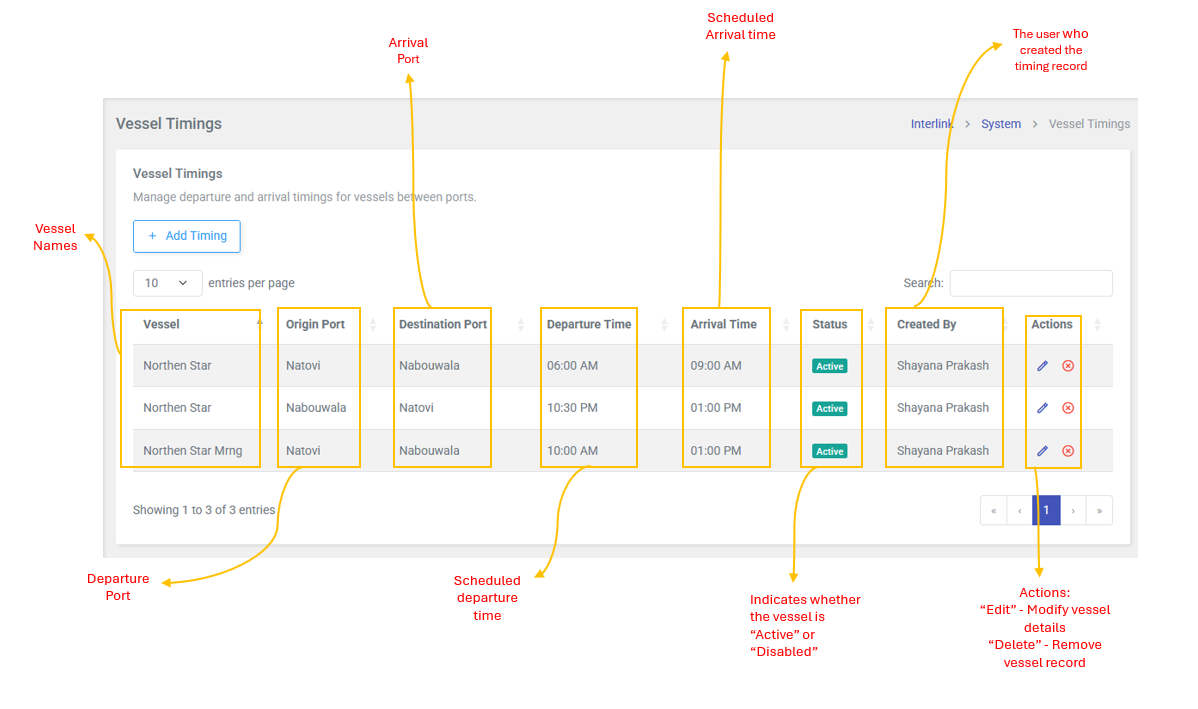 Manage departure and arrival timings for the vessels between ports. For example, the Northern Star departs Natovi at 6:00 AM and arrives at Nabouwalu at 9:00 AM.